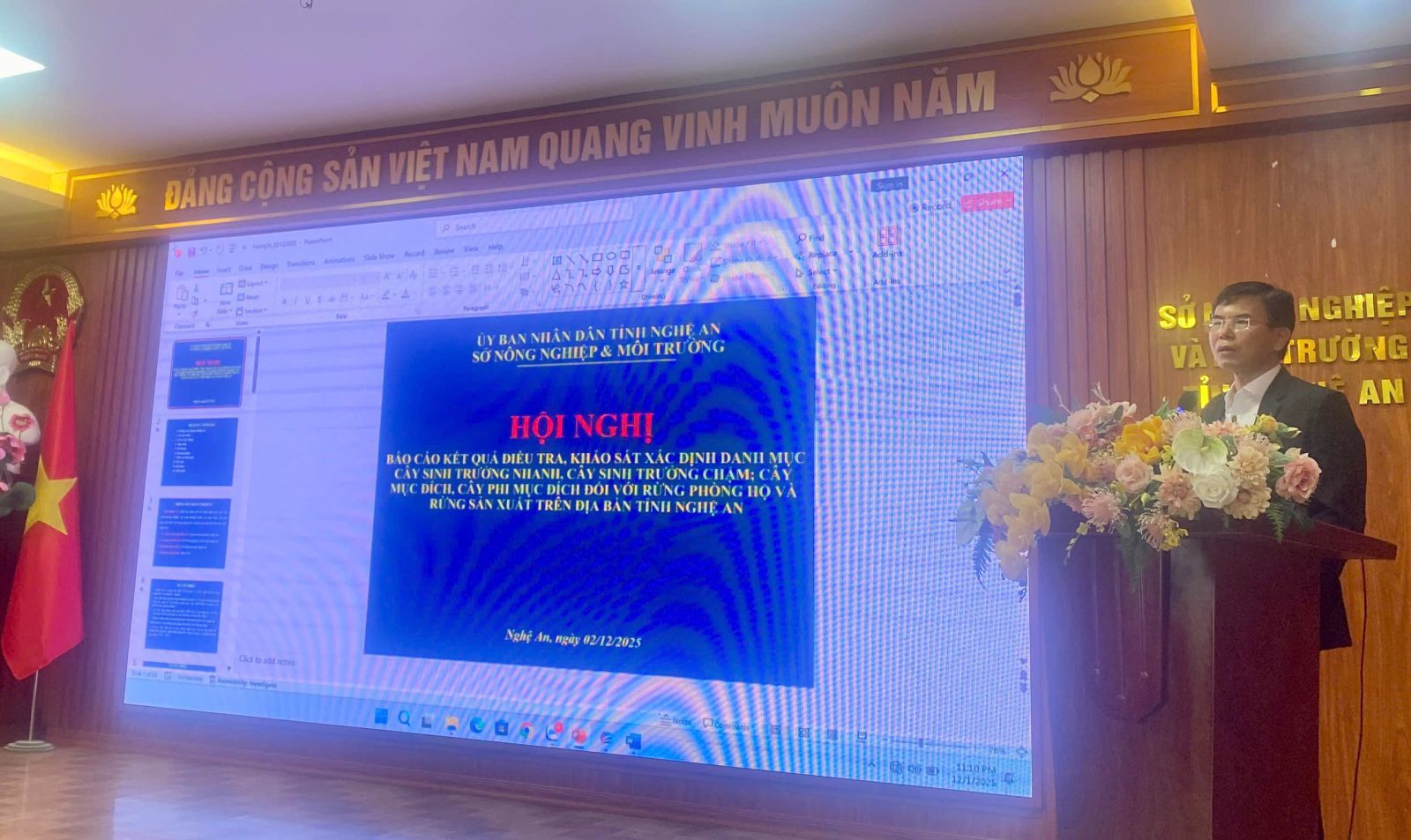 Ngày 02/12/2025, Sở Nông nghiệp và Môi trường Nghệ An tổ chức Hội thảo khoa học lấy ý kiến các chuyên gia, nhà khoa học và các đơn vị liên quan về kết quả nhiệm vụ “Điều tra, khảo sát xác định danh mục loài cây sinh trưởng nhanh – sinh trưởng chậm; cây mục đích – cây phi mục đích đối với rừng phòng hộ và rừng sản xuất trên địa bàn tỉnh Nghệ An”.