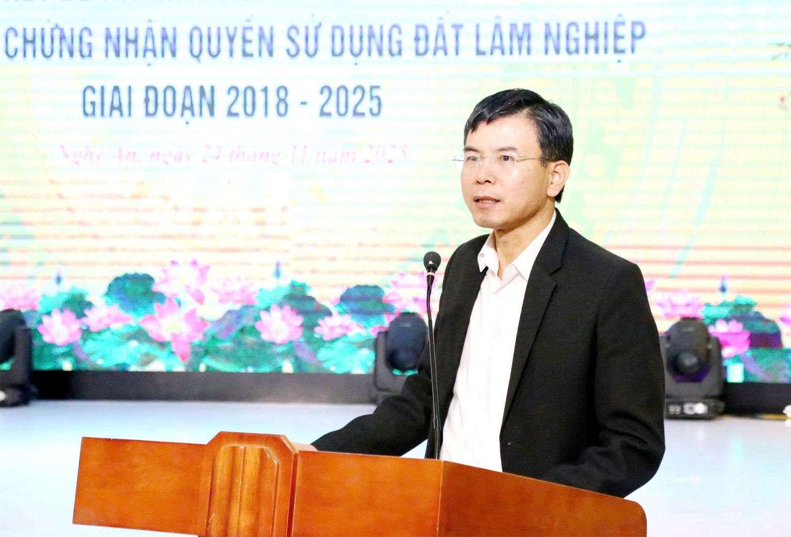 Phát biểu kết luận hội nghị, đồng chí Nguyễn Văn Đệ – Phó Chủ tịch UBND tỉnh ghi nhận những kết quả đạt được của các sở, ngành, địa phương, chủ rừng trong thực hiện Đề án giao rừng gắn với giao đất và cấp giấy chứng nhận quyền sử dụng đất lâm nghiệp giai đoạn 2018–2025. Để triển khai hiệu quả công tác quản lý, bảo vệ và phát triển rừng trong thời gian tới, đặc biệt là xây dựng “Đề án phát triển lâm nghiệp tỉnh Nghệ An giai đoạn 2026–2030”, đồng chí Nguyễn Văn Đệ, Phó chủ tịch UBND tỉnh yêu cầu các cấp, ngành và địa phương tập trung một số nhiệm vụ trọng tâm: Tiếp tục hoàn thiện hồ sơ, cơ sở pháp lý và xử lý các tồn tại trong giao đất, giao rừng; Tăng cường quản lý sau giao rừng, nâng cao vai trò của hộ gia đình và cộng đồng, đẩy mạnh chuyển đổi số trong quản lý lâm nghiệp; Chuẩn bị nội dung Đề án phát triển lâm nghiệp giai đoạn 2026–2030 theo hướng bám sát mục tiêu phát triển bền vững, thích ứng với biến đổi khí hậu; Chú trọng nâng cao chất lượng rừng tự nhiên, mở rộng rừng được cấp chứng chỉ quản lý rừng bền vững và diện tích rừng kinh doanh gỗ lớn.