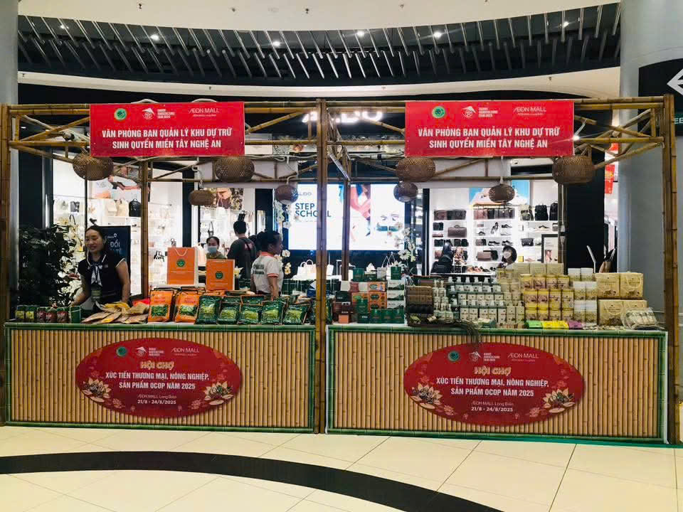 Từ ngày 21 tháng 8 đến ngày 24 tháng 8 năm 2025, Văn phòng Ban Quản lý Khu Dự trữ sinh quyển (KDTSQ) miền Tây Nghệ An đã tham gia Hội chợ Xúc tiến thương mại, Nông nghiệp, Sản phẩm OCOP năm 2025 tổ chức tại Trung tâm Thương mại AEON Mall Long Biên, thành phố Hà Nội.