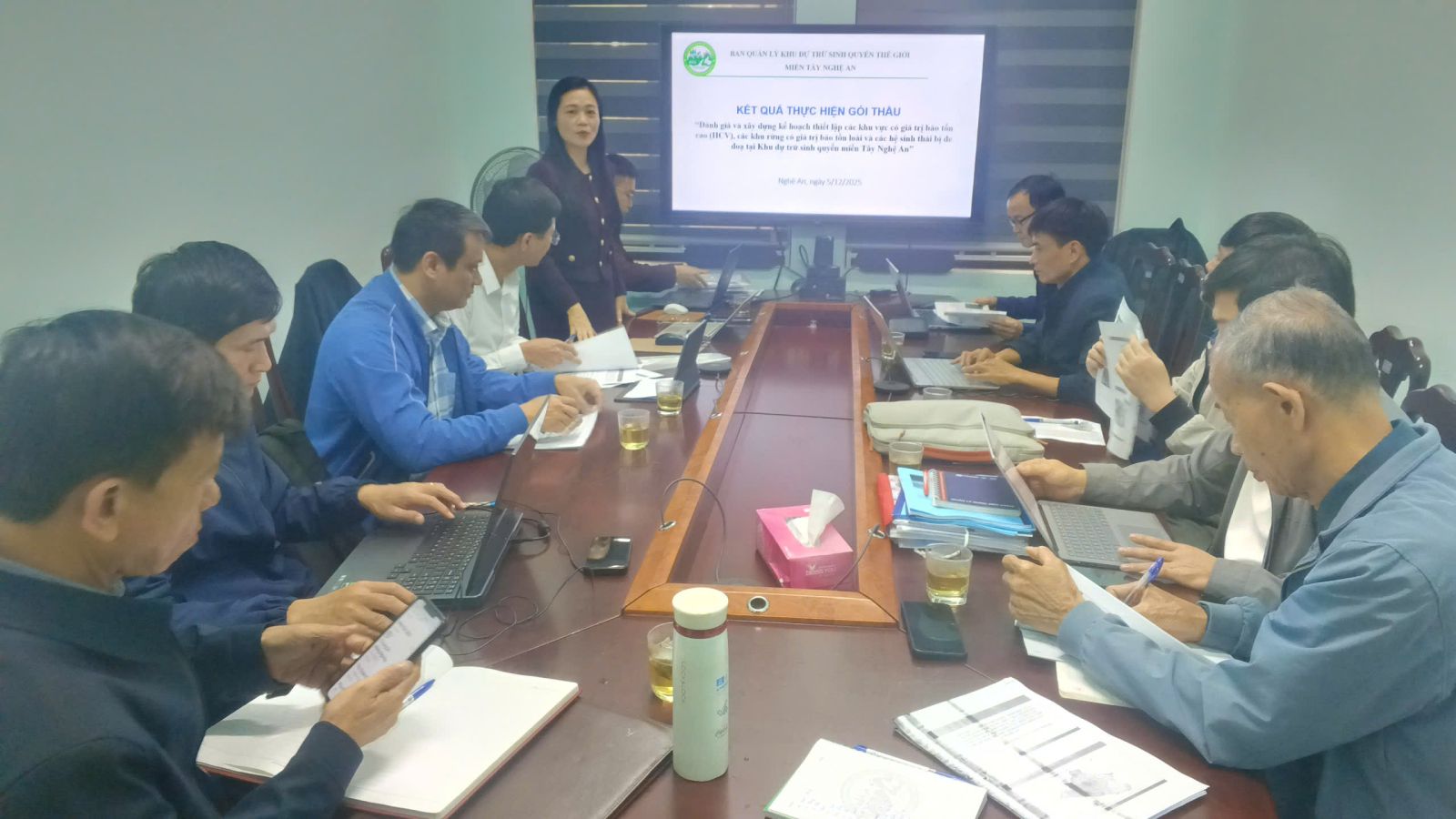 Chiều ngày 06/12/2025, tại Hội trường Văn phòng Ban Quản lý Khu Dự trữ sinh quyển miền Tây Nghệ An, Văn phòng Ban Quản lý Khu Dự trữ sinh quyển miền Tây Nghệ An đã tổ chức cuộc họp đánh giá kết quả triển khai, thực hiện nhiệm vụ các gói thầu chuyên môn với các đơn vị tư vấn liên quan, làm cơ sở trình Sở Nông nghiệp và Môi trường thẩm định, phê duyệt theo quy định.