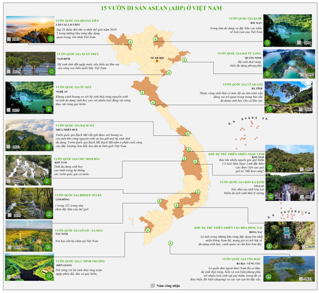 Đáng chú ý, Việt Nam có 03 khu bảo tồn thiên nhiên được công nhận trong đợt này, gồm: Vườn quốc gia Pù Mát (Nghệ An), Khu Bảo tồn Thiên nhiên và Văn hóa Đồng Nai, và Vườn quốc gia Xuân Thủy. Việc bổ sung này đã nâng tổng số Vườn Di sản ASEAN của Việt Nam lên 15, tiếp tục khẳng định vai trò tích cực và trách nhiệm của Việt Nam trong công tác bảo tồn đa dạng sinh học khu vực ASEAN.